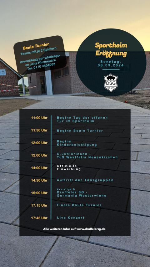 wir freuen uns Euch mitteilen zu dürfen, dass wir beim Neubau des Sportheims in Druffel auf die Zielgerade einbiegen. Die Handwerker sowie unsere Vereinsmitglieder setzen alles daran, pünktlich zum Einweihungstermin das Gebäude besenrein zu übergeben.