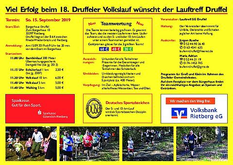 Am Sonntag 15.09.2019 findet in Druffel wieder das alljährliche Bürgerfest im Ortskern am Bürgerhaus statt. Bereits zum 18. Mal läd der Druffeler Lauftreff zu diesem Anlass alle laufbegeisterten Sportler zum Druffeler Volkslauf ein.