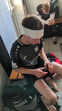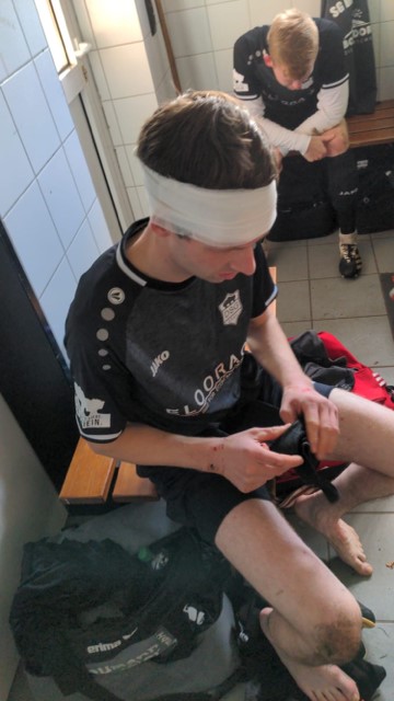 Von Beginn an entwickelte sich ein Spiel auf Augenhöhe. Druffel verteidigte mit viel Herzblut, St. Vit versuchte mit langen Diagonalbällen hinter die DSG- Abwehr zu kommen. Der Rückenwind in Hälfte 1 machte es den Druffelern relativ leicht, den Ball weit weg vom eigenen Kasten, heute gehütet von Philipp Wördekemper, zu halten. Den größten Einsatz zeigte wieder einmal Sechser Michi Peitz, der sich in einem Luft- Zweikampf allerdings gefühlt die halbe Stirn aufschlitzte, mit diesem 3cm Cut eigentlich noch weiterspielen wollte, aber dann von Frau Anika in die Klinik nach Wiedenbrück verfrachtet wurde, in der er wohl noch bis in die späten Abendstunden mit dem von Torwart Trainer Marius Hesse sauber erstellten Turban verweilen wird.