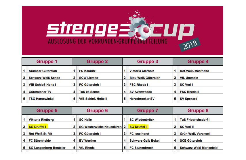 Vom 29.06.-01.07.2018 findet wieder der allseits beliebte Strenge-Cup für E-Junioren in Gütersloh statt. 40 Teams spielen von Freitag bis Sonntag den Sieger aus. In erster Linie geht es bei diesem Event aber darum, den Teamgeist zu stärken und ein gemeinsames Wochenende zu verbringen. Übernachtet wird im Zeltpark auf dem Sportgelände am LAZ-Nord in Gütersloh.