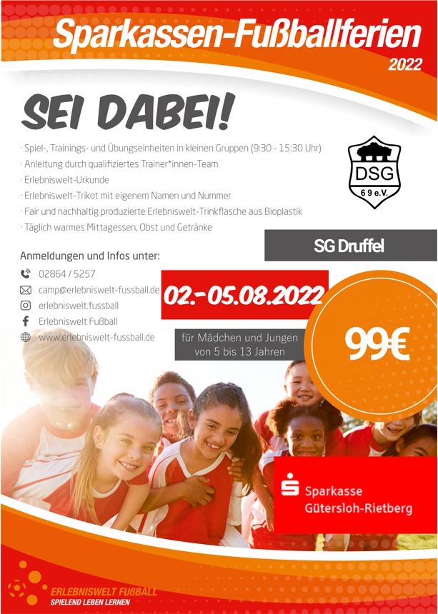 Vom 02. bis 05.08.2022 findet auch in diesem Jahr wieder das Sparkassen Fußballcamp an der Druffeler Oak Lane statt. Organiert wird das Camp von der Erlebniswelt Fußball.